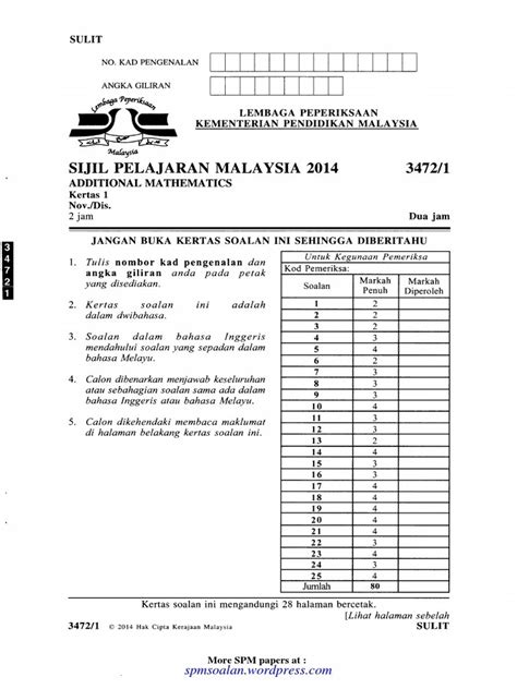 We have gotten the spm past year question 2014 for additional mathematics from the lembaga peperiksaan. Info (*) tiada peraturan pemarkahan. Bank (koleksi) soalan peperiksaan percubaan matematik tambahan (additional mathematics) spm + skema jawapan. The paper provided is originally .